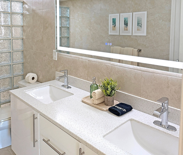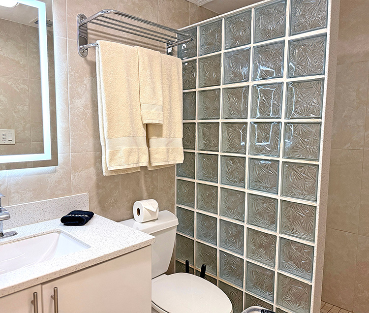 This full bathroom features a modern single vanity with sleek fixtures, a lighted mirror, and a walk-in shower with glass-block detailing. The space is efficiently designed and well-equipped, with starter amenities provided for your arrival.