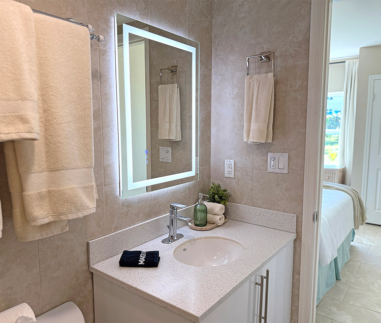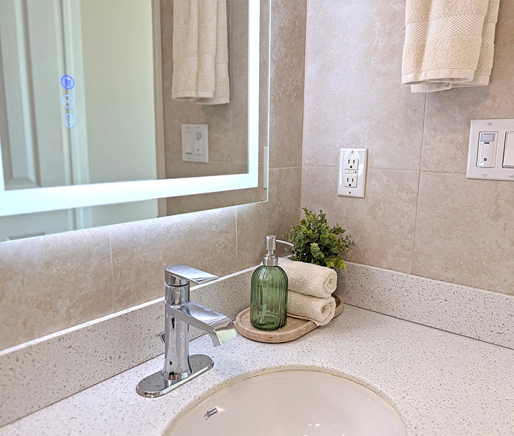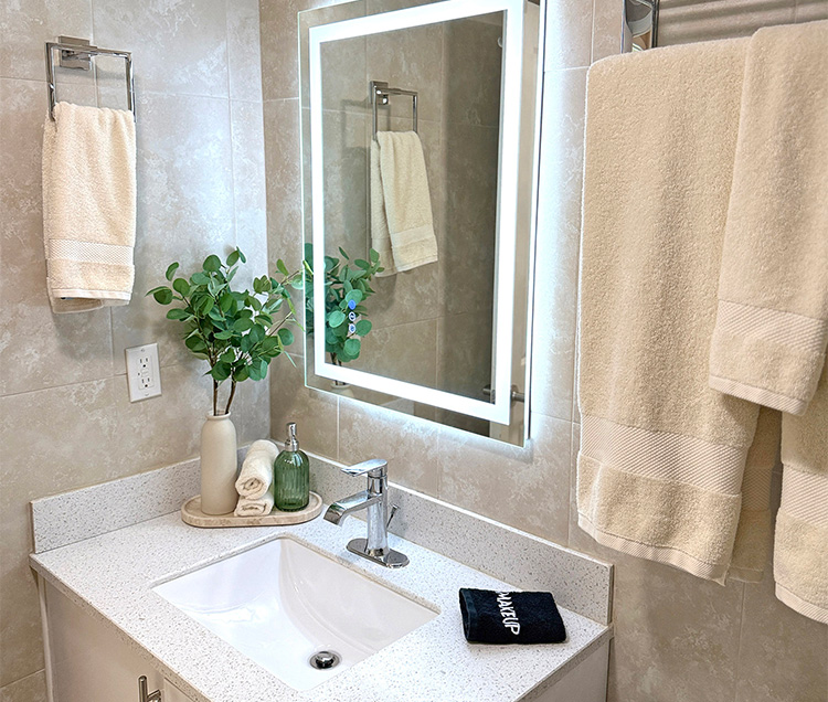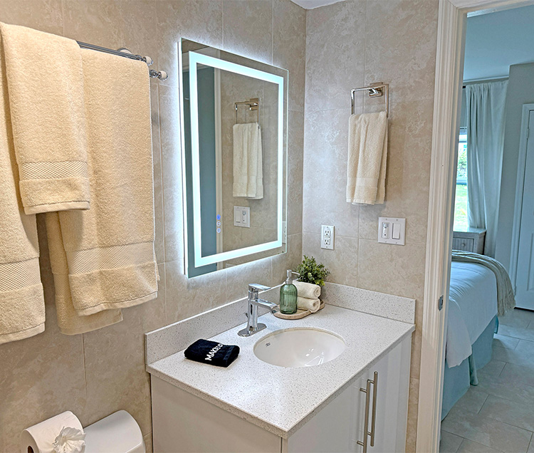 This ensuite bathroom features a modern single vanity with sleek fixtures, a lighted mirror, and a walk-in glass shower. The space is well-appointed and efficiently designed, with starter amenities provided for your arrival.