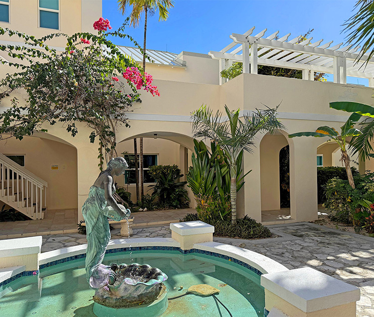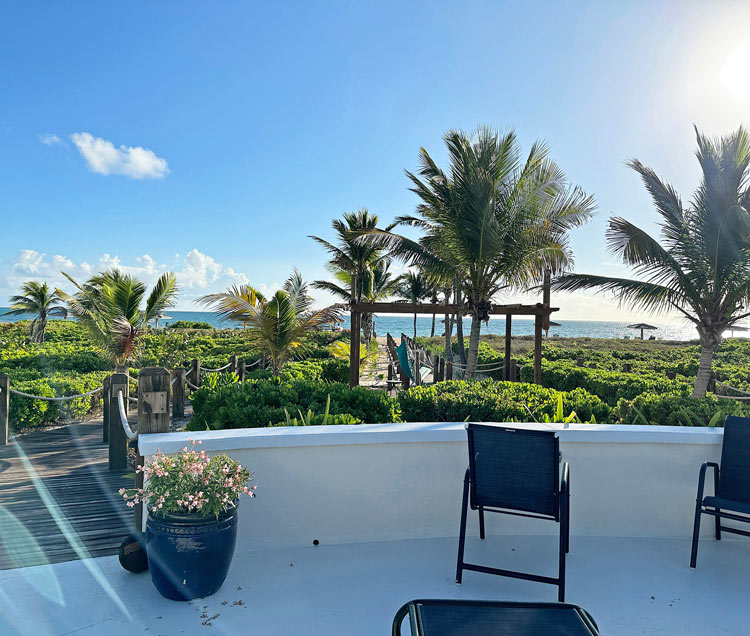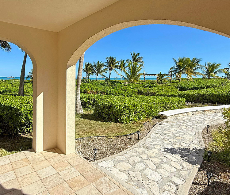 The property features two private patios with ocean views, each offering a different way to enjoy the outdoors. The master bedroom patio includes bar-height seating, while the second patio provides a dedicated outdoor dining area. Surrounded by tropical landscaping, both spaces offer a relaxed setting just steps from the pool and a short walk to the beach.
