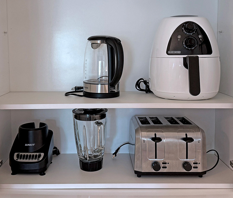 The fully equipped kitchen includes modern appliances, a stove and oven, a microwave, a dishwasher, and a refrigerator. It is stocked with cookware, utensils, dishes, and glassware, along with small appliances such as a coffee maker, toaster, blender, kettle, and air fryer. BBQ utensils are also provided for outdoor cooking.