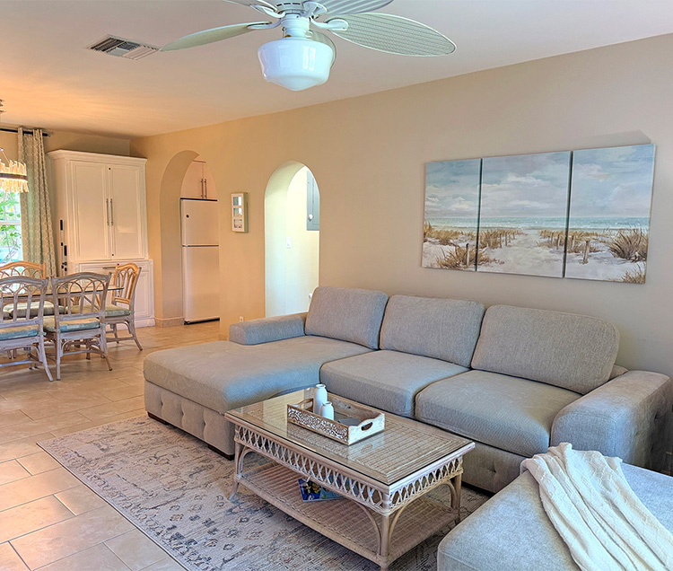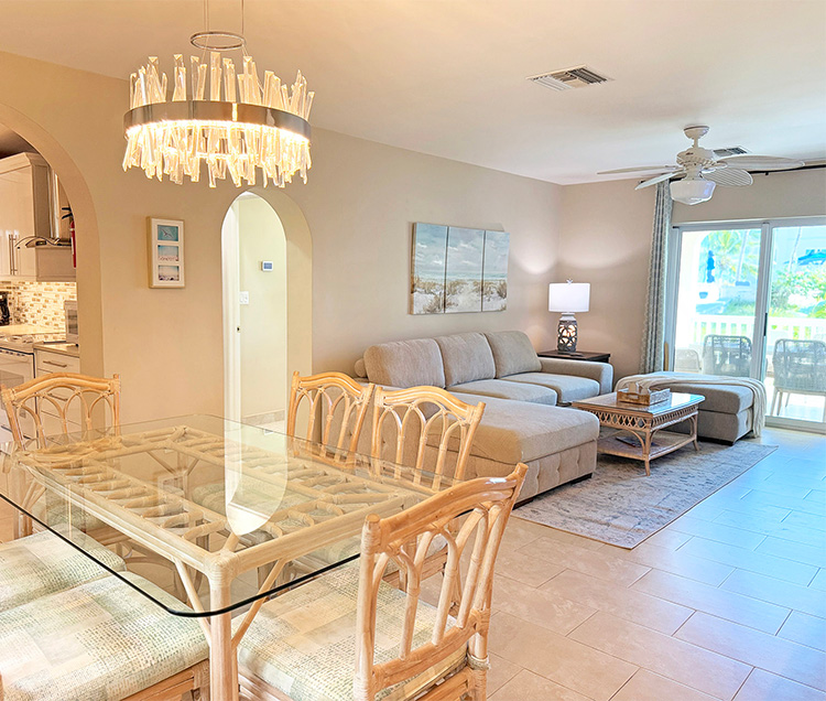 The open-concept living and dining area offers a bright and welcoming space with both indoor and outdoor dining options. The living area includes a TV, while the covered patio is conveniently located just off the space and overlooks tropical surroundings, providing a relaxed setting for meals and an island atmosphere.
